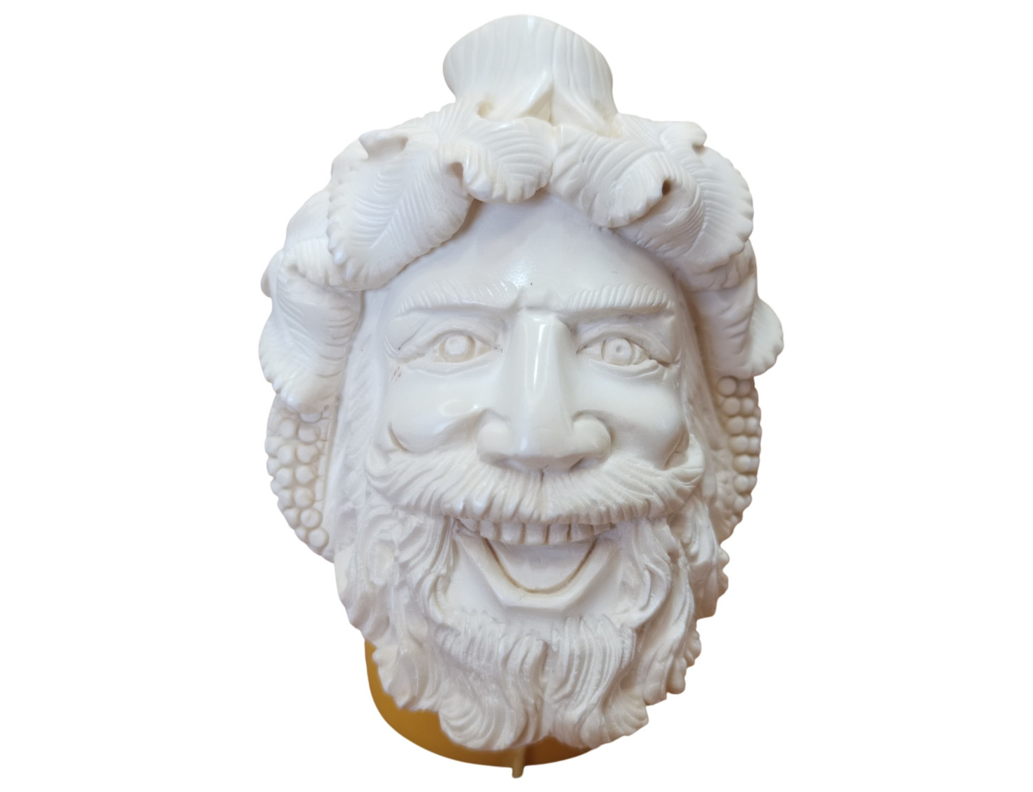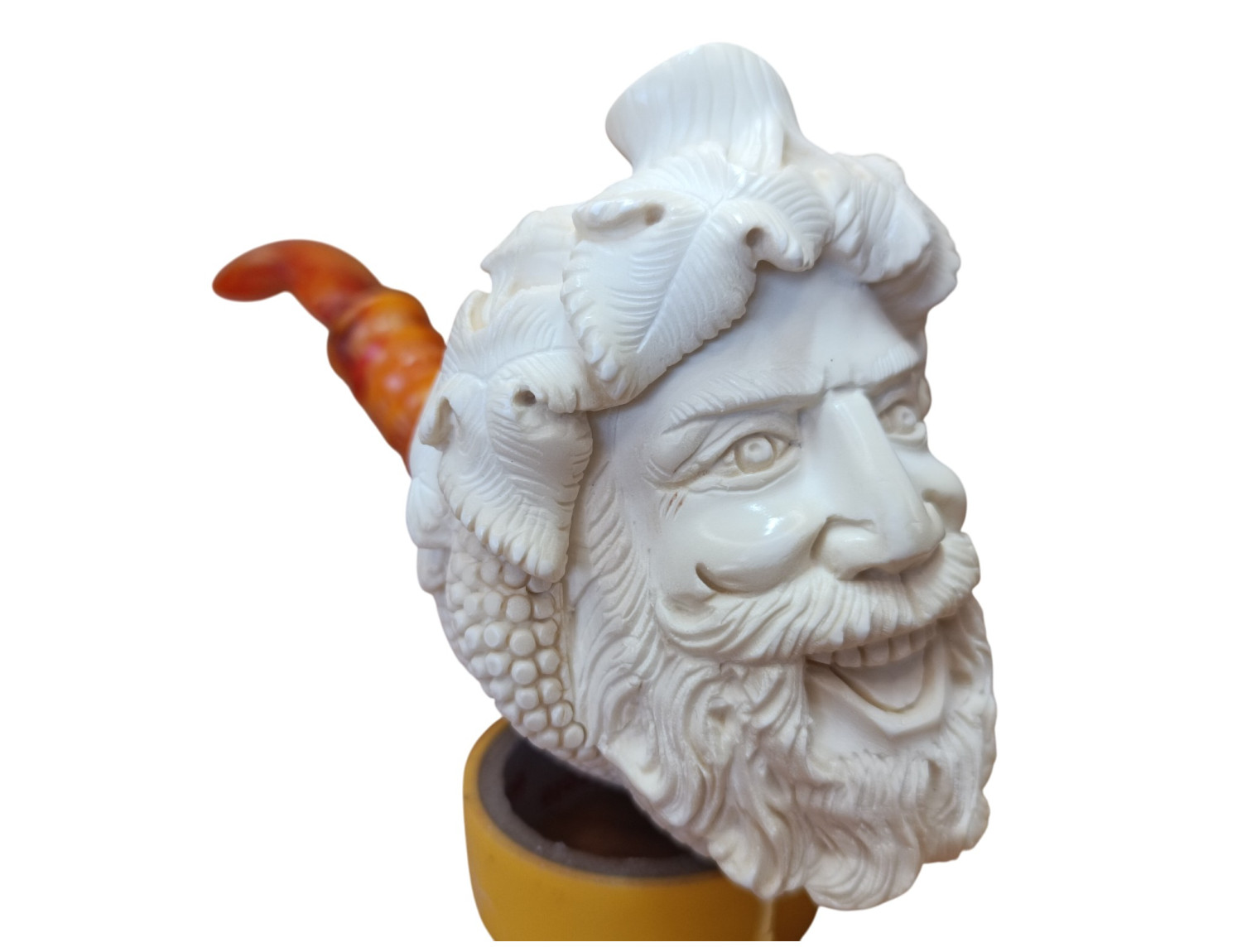 Look closely: grape leaves crown his brow, each vein deeply worked; hair strands carved in layers like twisting stems; chin-rounded softness of youthful god contrasted with ancient weight beneath his eyes. He is the only Olympian who welcomed mortals at his table — and this pipe, likewise, welcomes its owner.