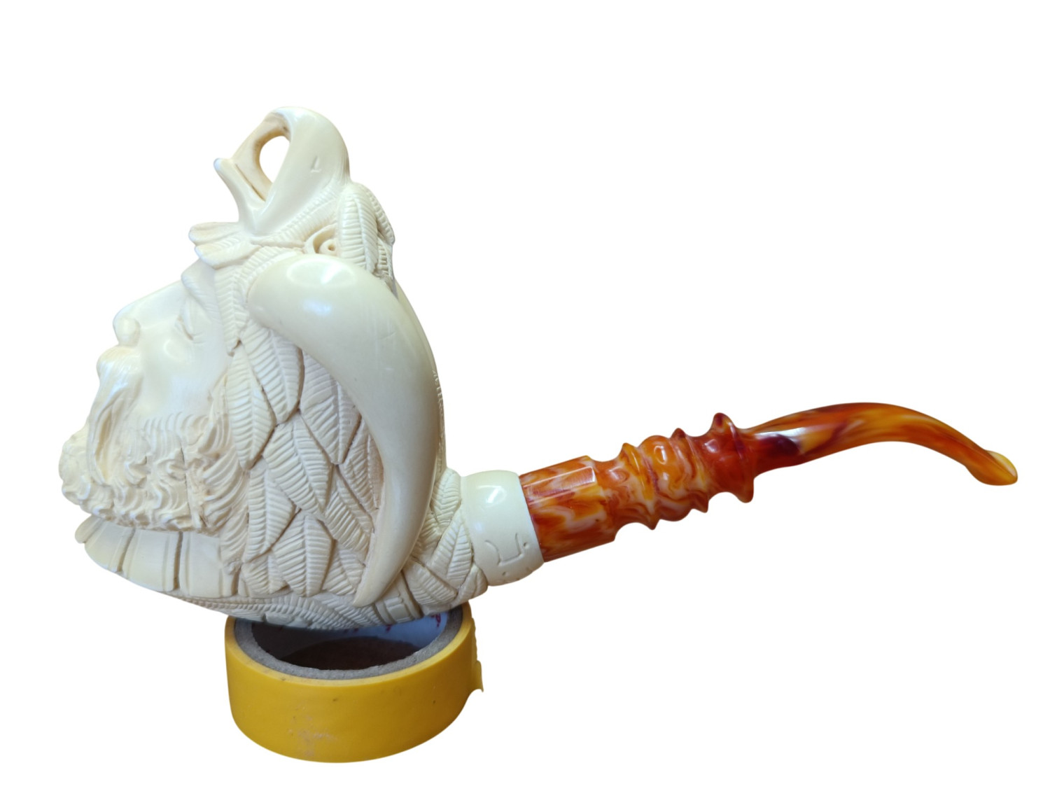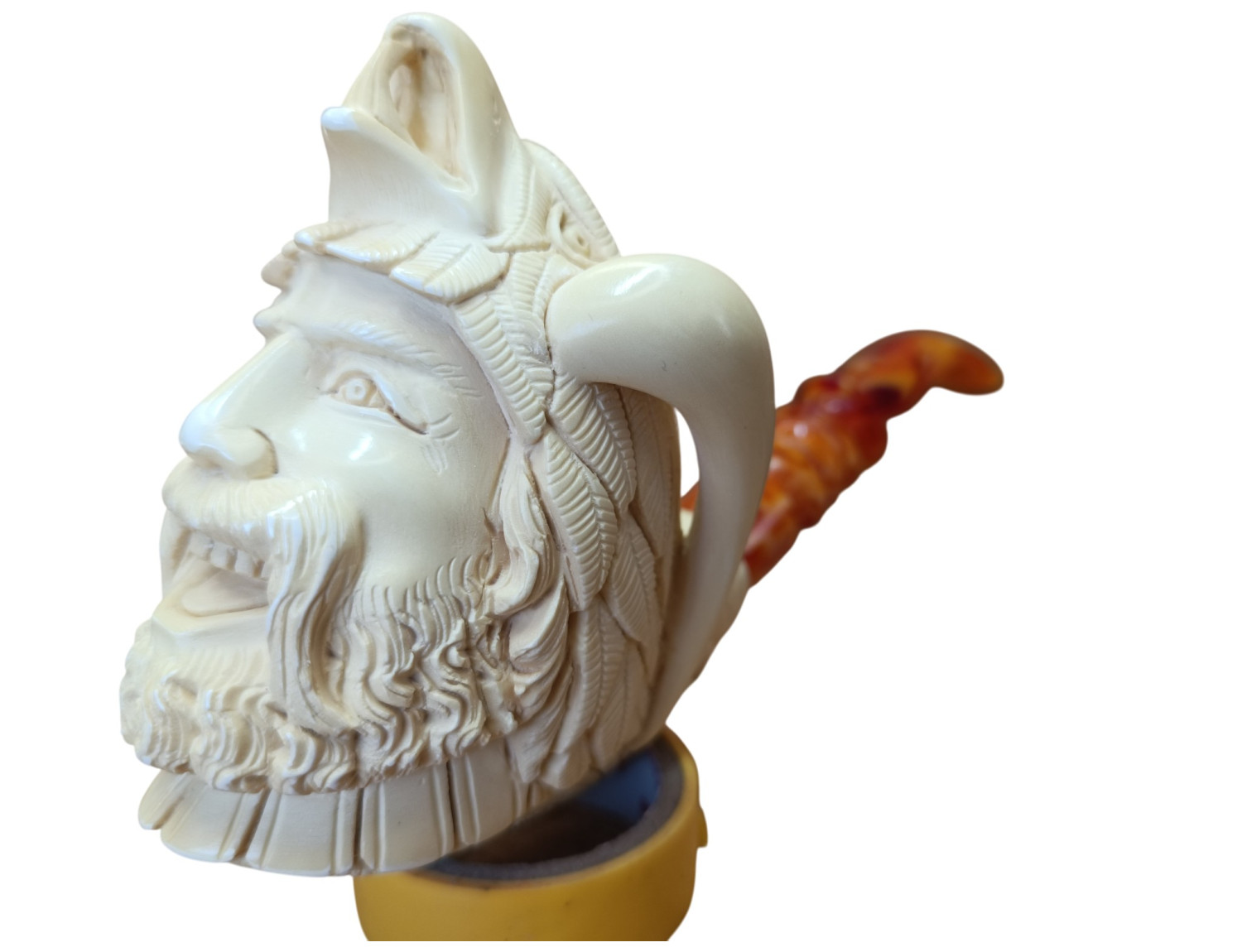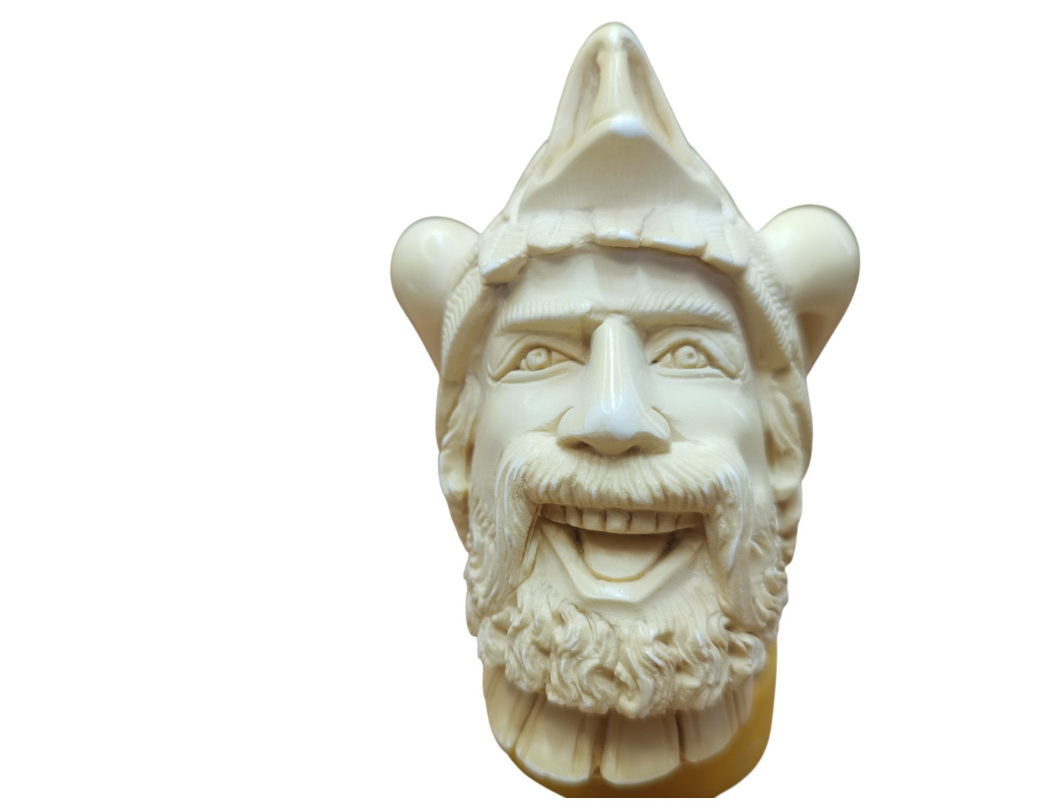 Carving a face is among the most challenging work in meerschaum craft. Human expression cannot be guessed — it must be precise. A millimeter too wide in the grin and it becomes mockery; a line too shallow and emotion disappears. The artisan who carved this warrior has captured life, where muscle tension, smile curvature, and brow slope harmonize perfectly.