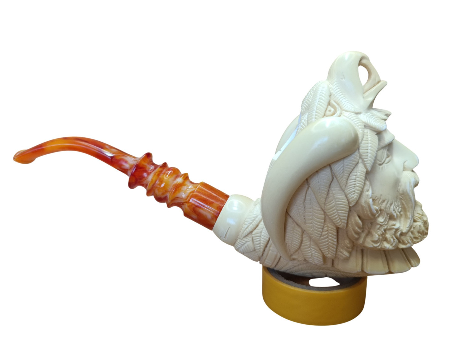 Meerschaum’s pale ivory tone gives brightness to expression, while time will slowly add shadow-tones of honey and amber. Eventually the warrior will not only laugh — he will glow.