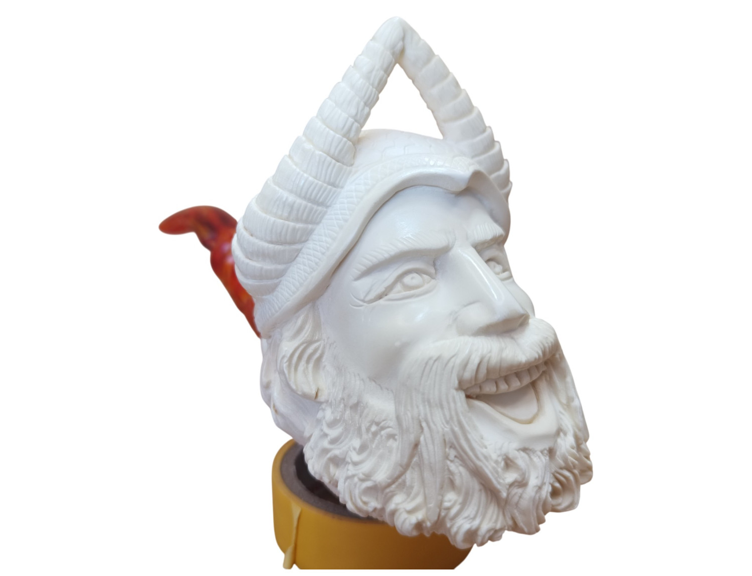 The Block Meerschaum Viking With Double Horn Helmet Pipe stands like a relic of northern fire — a warrior with ice-seasoned eyes, a beard thick like winter forests, and a helmet crowned not with one but two wolf-curved horns rising upward like the spirits of battle. This is not merely a pipe; it is a carved saga — a frozen moment of saga poetry, a war-song turned into mineral and breath. It embodies courage, raw laughter, iron pride, and the sound of shields striking longboats at dawn.