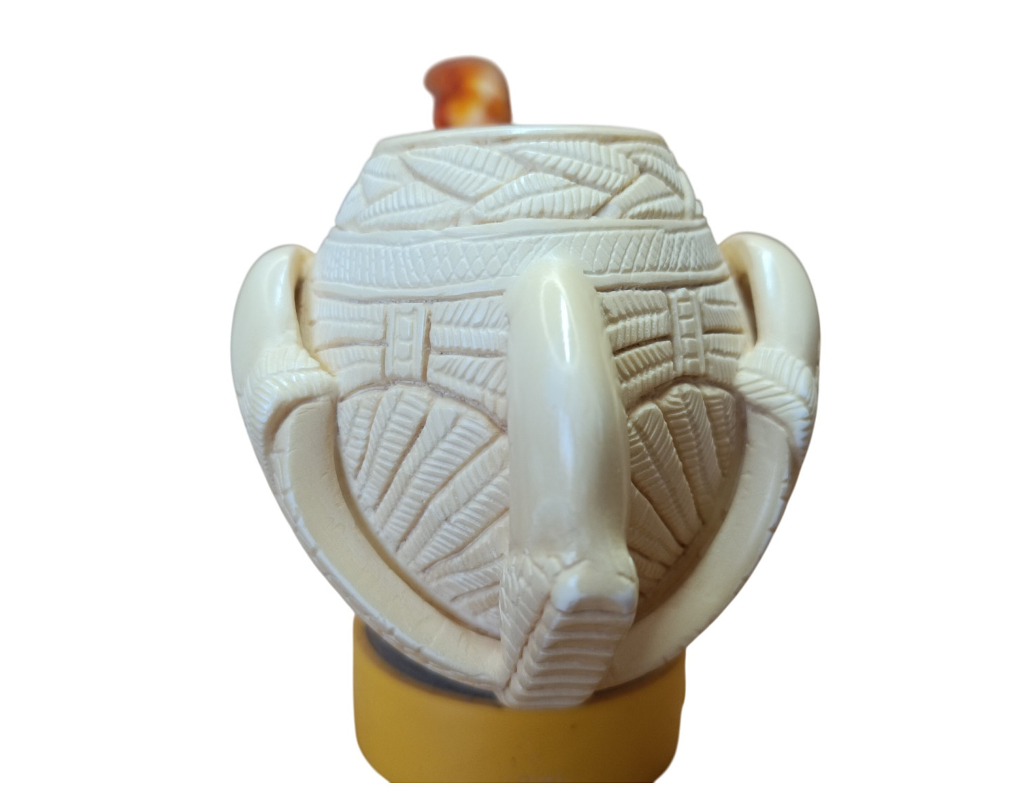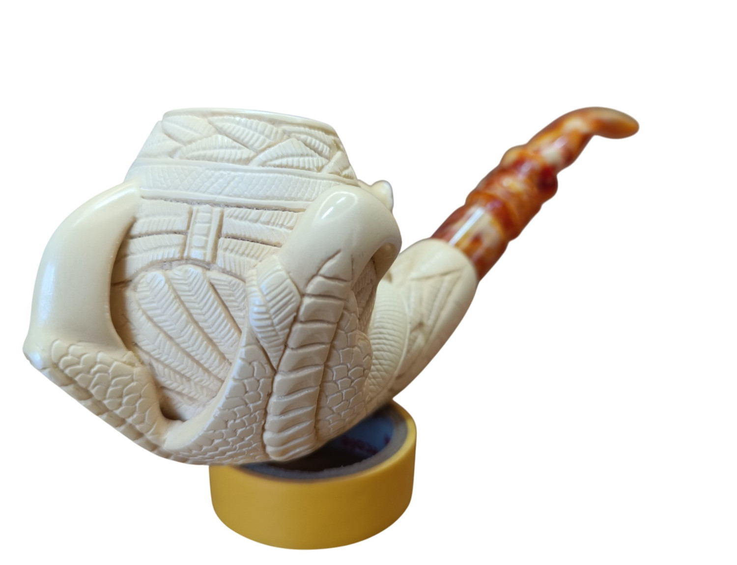 Meerschaum begins soft white like polished bone. With use it deepens — not evenly, but alive, like feathers aging from tip to root. Each smoke adds pigment. Edges darken first — high points catching oils like birds catching sun. Then deeper grooves turn amber, followed by full-body golden bloom.